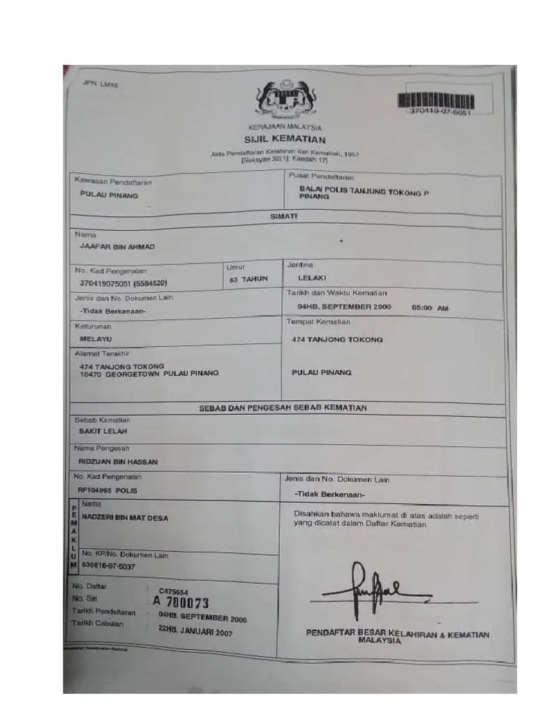 Tak nak pening la, sebagai anak kepada simati korang perlu bawa kad pengenalan ic dan salinan sijil kematian je. Akta pendaftaran kelahiran dan kematian 1957 akta . Pemaklum atau waris si mati boleh mengambil sijil kematian di pejabat jpn yang telah ditetapkan. Sijil perkahwinan suami dan isteri asal dan salinan kategori 2. Sijil kematian ialah suatu dokumen perakuan maklumat mengenai kematian. Akta pendaftaran kelahiran dan kematian,1957 seksyen 31 dan .